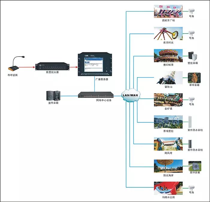 本次廣播主要覆蓋西班牙廣場、魔幻城堡、冒險(xiǎn)山、歡樂時(shí)光、金礦鎮(zhèn)、香格里拉·雪域、颶風(fēng)灣、陽光海岸,瑪雅水公園九大區(qū)域,每個(gè)區(qū)域可實(shí)現(xiàn)獨(dú)立控制。根據(jù)景區(qū)廣播需要,對整個(gè)景區(qū)廣播進(jìn)行分區(qū)管理,即可實(shí)現(xiàn)對景區(qū)的整體播放,也可以實(shí)現(xiàn)對單個(gè)或多個(gè)區(qū)域組合進(jìn)行播放,對景區(qū)的環(huán)境營造好的旅游氣氛。利用廣播傳播當(dāng)?shù)氐某鲂行畔ⅰ⑻鞖忸A(yù)報(bào)、游園須知等。