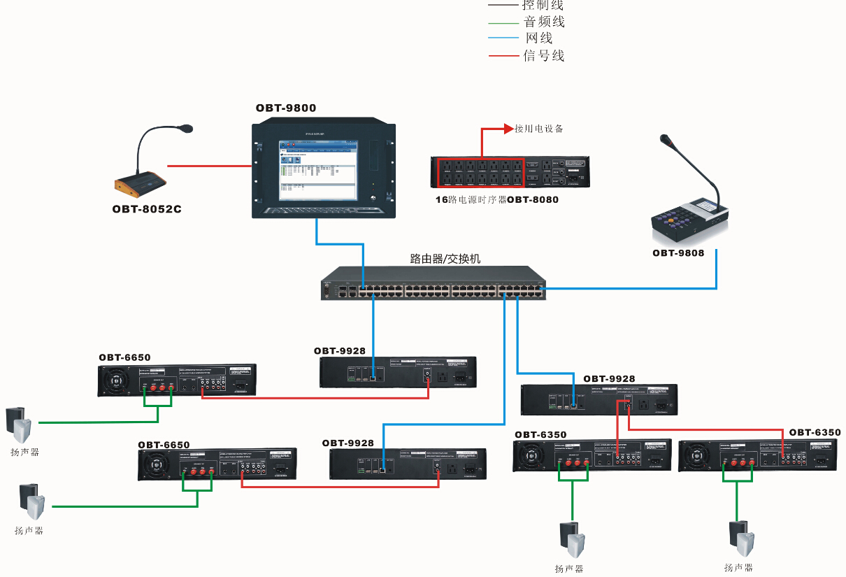 校園廣播主控室安裝在網絡中心,配置有主服務器(OBT-9800,OBT-9800S),音源設備,IP尋呼話筒,遠程控制設備及其他周邊設備;主控室負責整套系統的運行配置,對整個校園廣播進行集中控制,可實現采播,尋呼喊話等功能。