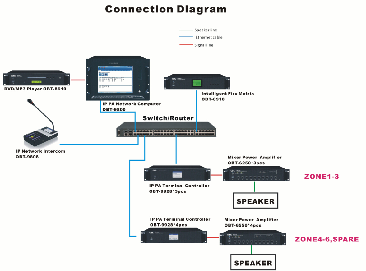 整個系統設計如下:由于云南宛水公園面積大、覆蓋區域廣、功能區域相對獨立,根據這種特殊場所需求,系統選擇了先進的TCP/IP網絡廣播系統。IP網絡廣播系統是一套基于IP數據網絡傳輸的音頻擴聲系統,它可在同網段的局域網內、跨網關的局域網內或Internet網上使用。穩定可靠的網絡廣播直接取決于網絡服務器及網絡適配器軟硬件結合的完好性能。IP網絡廣播系統是由IP網絡廣播控制中心、IP網絡適配器、音頻工作站等組成。系統采用高速的雙CPU處理(32位MCU+16位DSP),數字功放,延時短(0.1s)音質好(20-16KHZ),支持各種音頻格式的數據網絡傳送(MP3、MP2、AAC、WAV),完善的網絡適應能力,同時支持外接音頻的實時編碼,具有:IP地址自動獲得(DHCP)、直接跨網關及核心路由交換機的功能、支持互聯網廣播,網絡流量自適應等功能。